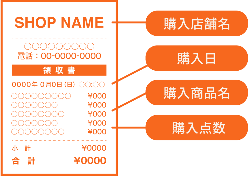 オンラインショップをご利用の場合は、レシートの代わりに「領収書」または「納品書」の画像をアップロードしてください。その際も、購入店舗名(不記載でも可)、購入日、商品名(JANコードでも可)、購入点数が確認できるように撮影してください。